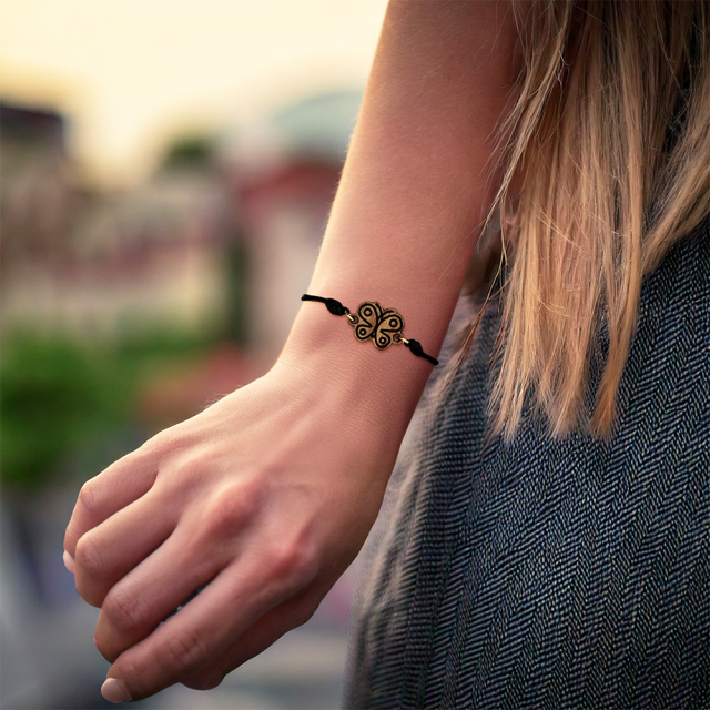 Das Band besteht aus gewachstem Polyesterkordel – es ist leicht, angenehm auf der Haut und in der Größe verstellbar. Die Knoten lassen sich individuell anpassen, sodass das Armband bequem sitzt und leicht an- und abgelegt werden kann.