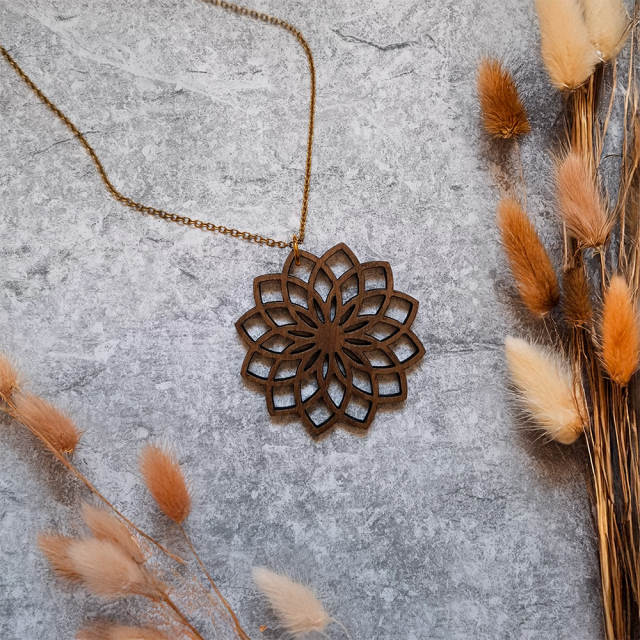 Diese elegante Halskette vereint natürliche Materialien mit modernem Design und einem starken Fokus auf Nachhaltigkeit. Der kunstvolle Anhänger wird aus furniertem 3 mm HDF-Holz gefertigt, das aus verantwortungsvoller europäischer Forstwirtschaft stammt. Dabei haben Sie die Möglichkeit, zwischen verschiedenen Holzarten zu wählen, um den Ohrringen Ihre ganz persönliche Note zu verleihen. Der Anhänger zeichnet sich durch feine, präzise Ausschnitte aus, die das Design subtil unterstreichen und ihm eine besondere Tiefe verleihen. Diese Details machen jedes Schmuckstück einzigartig und zu einem echten Blickfang.