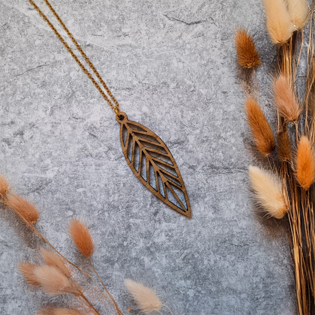 Diese elegante Halskette vereint natürliche Materialien mit modernem Design und einem starken Fokus auf Nachhaltigkeit. Der kunstvolle Anhänger wird aus furniertem 3 mm HDF-Holz gefertigt, das aus verantwortungsvoller europäischer Forstwirtschaft stammt. Dabei haben Sie die Möglichkeit, zwischen verschiedenen Holzarten zu wählen, um den Ohrringen Ihre ganz persönliche Note zu verleihen. Der Anhänger zeichnet sich durch feine, präzise Ausschnitte aus, die das Design subtil unterstreichen und ihm eine besondere Tiefe verleihen. Diese Details machen jedes Schmuckstück einzigartig und zu einem echten Blickfang.