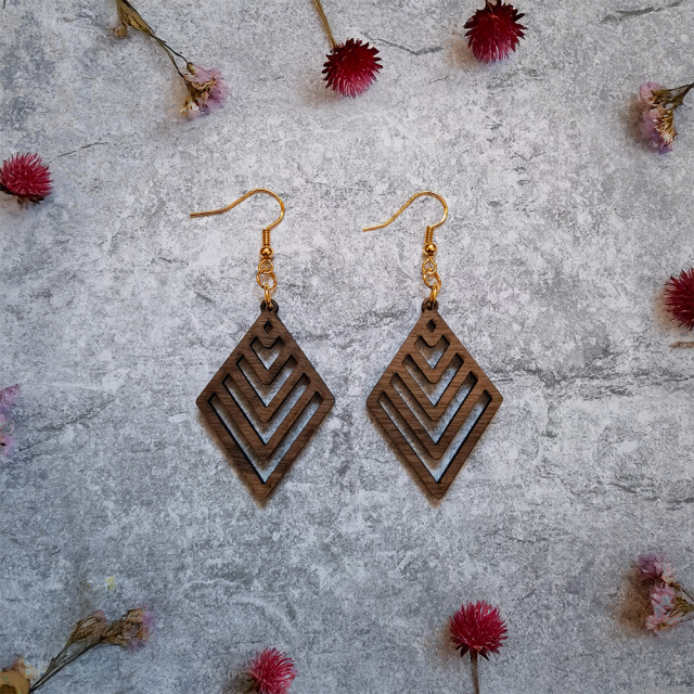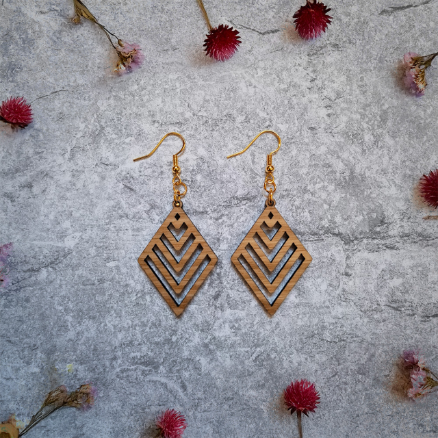 Diese eleganten Ohrringe vereinen natürliche Materialien mit modernem Design und einem starken Fokus auf Nachhaltigkeit. Die kunstvollen Anhänger werden aus furniertem 3 mm HDF-Holz gefertigt, das aus verantwortungsvoller europäischer Forstwirtschaft stammt. Dabei haben Sie die Möglichkeit, zwischen verschiedenen Holzarten zu wählen, um den Ohrringen Ihre ganz persönliche Note zu verleihen. Jeder einzelne Ausschnitt ist präzise ausgearbeitet und verleiht den Ohrringen eine individuelle Note. Die natürliche Holzstruktur macht jedes Exemplar einzigartig und zu einem echten Blickfang.